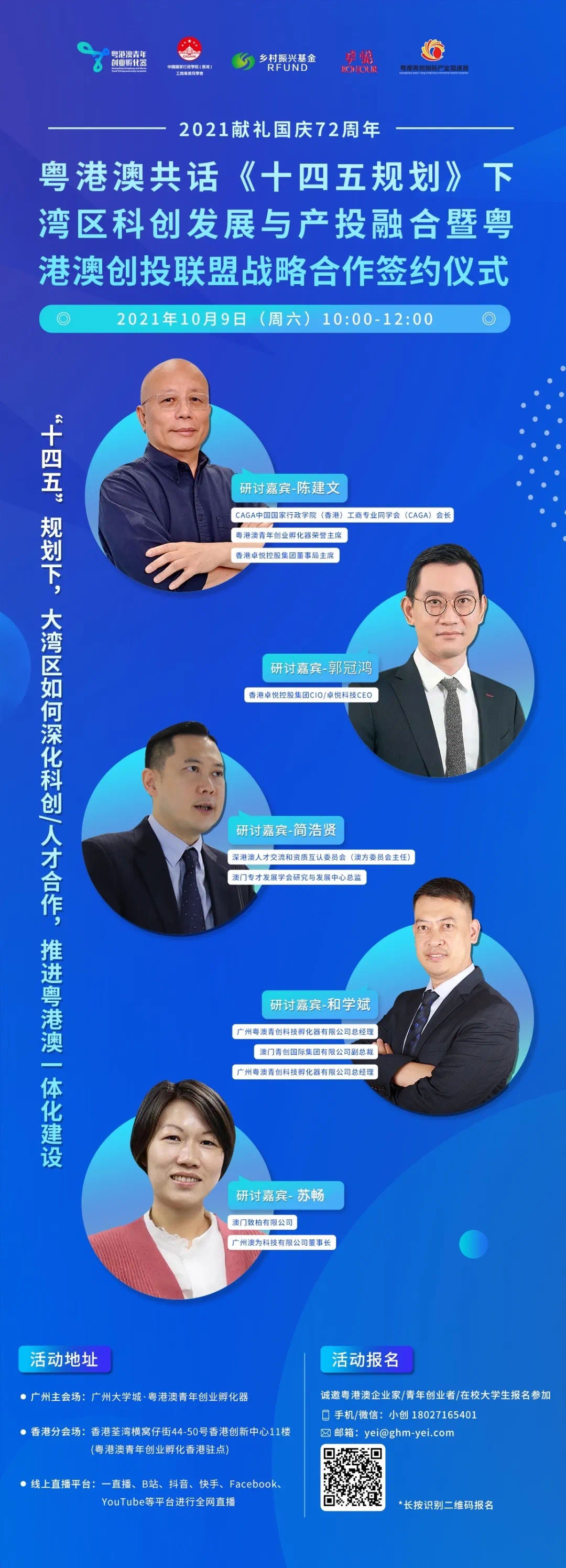 粤港澳青年创业孵化器联合中国国家行政学院(香港)工商专业同学会(“简称CAGA”),携手香港卓悦控股集团、广东乡融股权投资基金管理有限公司、粤澳青创国际产业加速器将于2021年10月9日上午举行“【献礼国庆72周年】粤港澳共话《十四五规划纲要》下湾区科创发展与产投融合暨粤港澳创投联盟战略合作签约仪式”活动,活动邀请粤港澳台四地政府领导、港澳企业家、科创项目投资专家、优秀青年创业者、青年大学生共同参与,旨在促进港澳企业家及青年创业者更好地融入国家发展大局,加强粤港澳产学研协同发展,推进综合性国家科学中心建设,更好地深化粤港澳大湾区科创协同发展,促进大湾区产投融合对接,推动粤港澳科创融合,实现可持续发展。