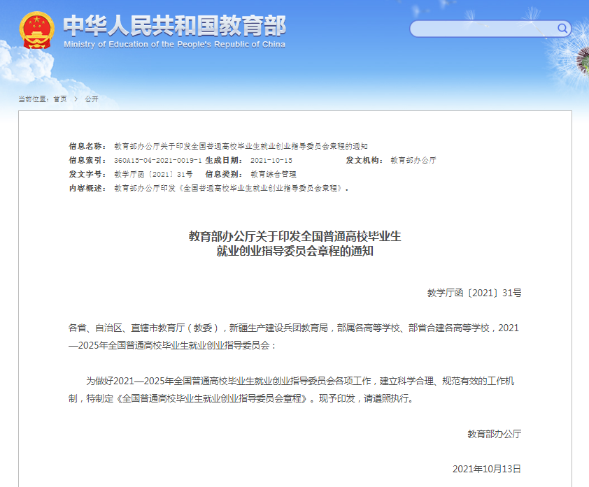为做好2021—2025年全国普通高校毕业生就业创业指导委员会各项工作,建立科学合理、规范有效的工作机制,特制定《全国普通高校毕业生就业创业指导委员会章程》。现予印发,请遵照执行。