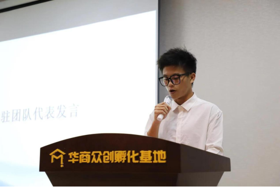 接着,团队代表黄镇杰同学上台发言。他相信在座的每位同学都是怀揣梦想的人,积极投身创新创业并希望能创造出自己的成绩。他衷心地感谢学校给予了他们机会,为他们提供一个优质的创业环境。国家赋予青年的使命,在领导和老师的帮助和关怀下,他们将竭尽自己所能自我提升,增强对外学习意识,构建团队和谐形态圈,与同伴携手开启创业道路新征程。他相信各项目团队定能在这里绽放光彩,实现应有价值,走向创业成功之路。