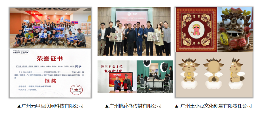 广州华商学院大学科技园与桃花岛传媒等企业合作共建创新创业实践实训中心,为华商师生提供高标准、高质量、高性能的实验实训实践场地及配套支持,成功帮助多家企业实现科技成果转化、科技创业孵化、创新人才培养。严杰辉带着华商学子在广州、杭州、北京等地创办广州元甲互联网科技有限公司等7家公司,年营业额超1.2亿元。广州土小豆文化创意有限责任公司建立B2B+B2C文创产品商务发展模式,自主研发并落地产品达20件以上。广州小黑科技有限公司林逸灏的创业项目《肆拾柒度乡村长者食堂》和广州澜运生物科技有限公司的创业项目《“榄”住清香之乌榄叶精油产业开发——以增城区邓山村为例》被评定为广东“领头雁”示范项目。