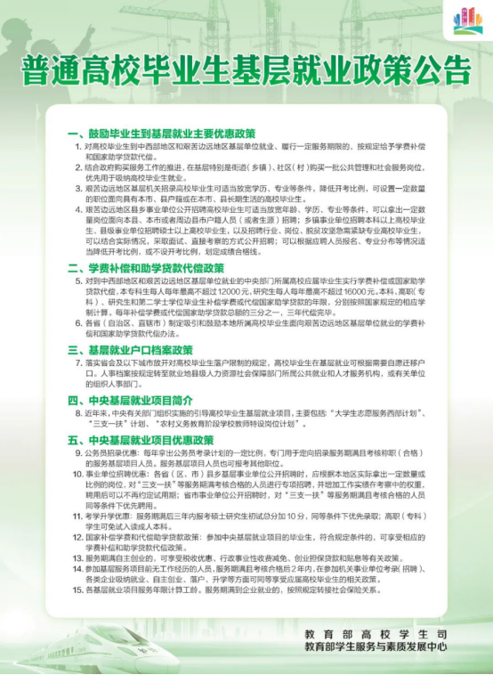 12.国家补偿学费和代偿助学贷款政策:参加中央基层就业项目的毕业生,符合规定条件的,可享受相应的学费补偿和助学贷款代偿政策。