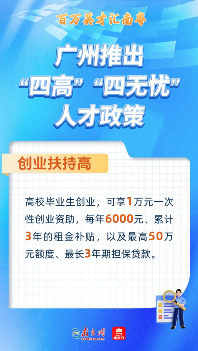 创业扶持高。高校毕业生创立企业,可享1万元一次性创业资助,每年6000元、累计3年的租金补贴,以及最高50万元额度、最长3年期担保贷款。“赢在广州”创业大赛获奖项目,给予最高10万元扶持资金;2年内在广州落地注册的,再给予最高20万元项目资助。入选广州市创新创业团队项目最高可获得1000万元项目补助。