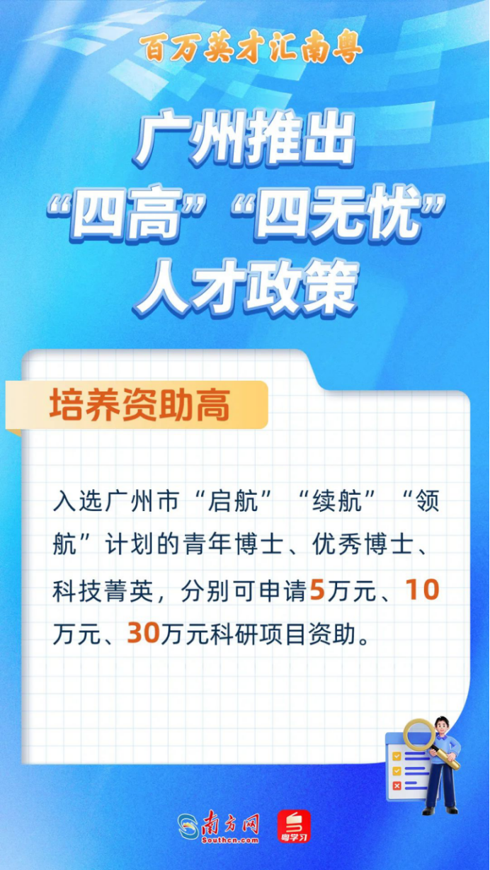 培养资助高。入选广州市“启航”“续航”“领航”计划的青年博士、优秀博士、科技菁英,分别可申请5万元、10万元、30万元科研项目资助。参加职业技能提升培训,最高给予3000元补贴。