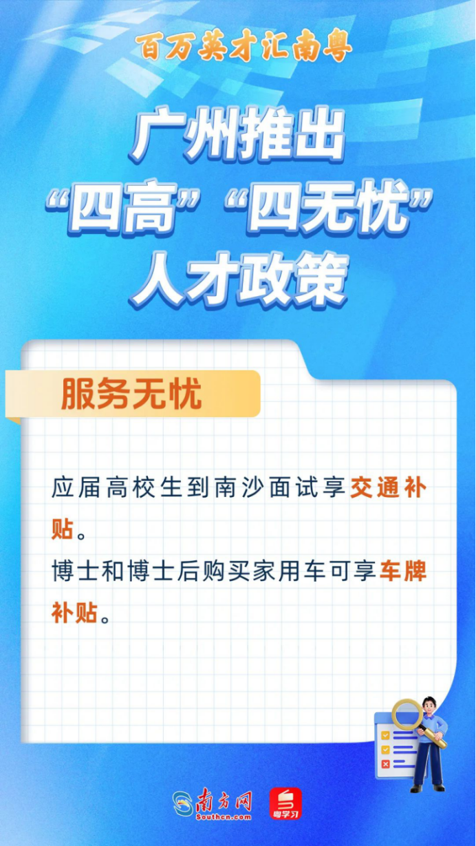 服务无忧。省内外及港澳地区应届高校生到南沙面试享交通补贴。博士和博士后购买家用车可享车牌补贴。市属博物馆向人才及随行家属免费开放。广州图书馆提供绿色通道、活动空间、数字图书馆、免费送书上门等服务。