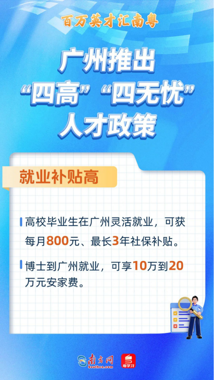 就业补贴高。在广州灵活就业的高校毕业生,给予每月800元、最长3年社保补贴。博士到广州就业,可享10万-20万元安家费。在黄埔区就业和落户,按博士5万元、硕士3万元,再给予奖励;在南沙区就业和落户的全日制本科生和硕士、博士,分别再给予3万元、6万元、12万元补贴。