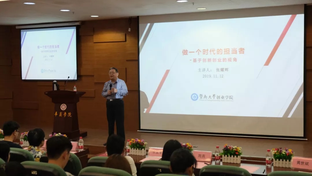 2019年11月12日下午,我校与广州市高校毕业生就业指导中心联合举办的“阳光就业·事业扬帆”就业创业指导讲座进校园活动在图书馆一楼报告厅举行。国家万人计划教学名师、暨南大学创业学院院长张耀辉教授为我校师生做了题为“做一个时代的担当者,基于创业视角”精彩讲座。学校副校长张捷教授、校长助理、创新创业学院常务副院长余家军博士、创新创业学院林绣月博士等近300名师生聆听讲座。