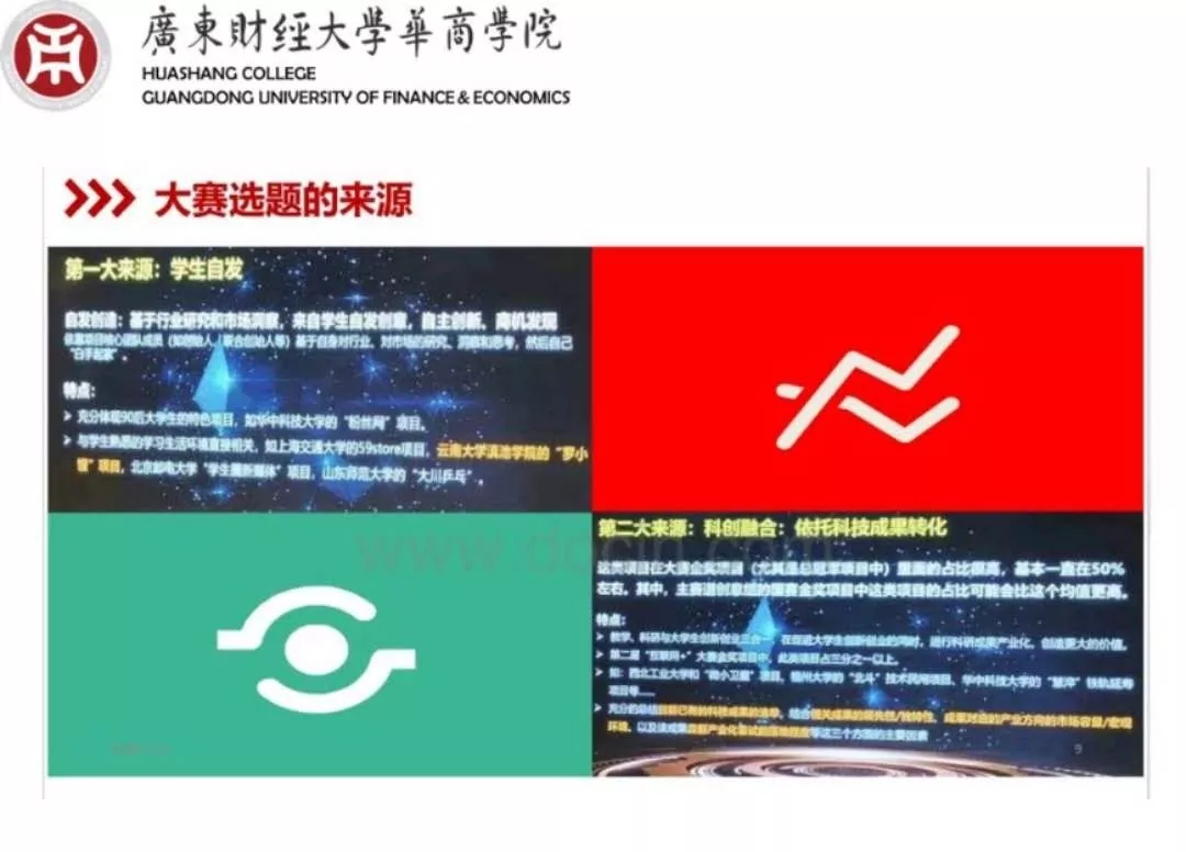 大赛包括六大选题来源,分别是:学生自发、依托科技成果的转化、产教融合、专创融合、“互联网+” 新技术以及老师、校友、学生之间的共创,具体的赛题选择还是需要根据同学们的自身情况而定。