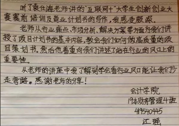 看了以上的优秀观后感,相信同学们在此次讲座中收获了不少干货,在讲座的最后老师也耐心为大家解答了许多问题,每一次讲座,都是思想与火花的碰撞。疫情期间,虽然不能外出,我们还是能参加各种精彩的线上活动,抓住每一次机遇,你终会成为一个优秀的创业人!