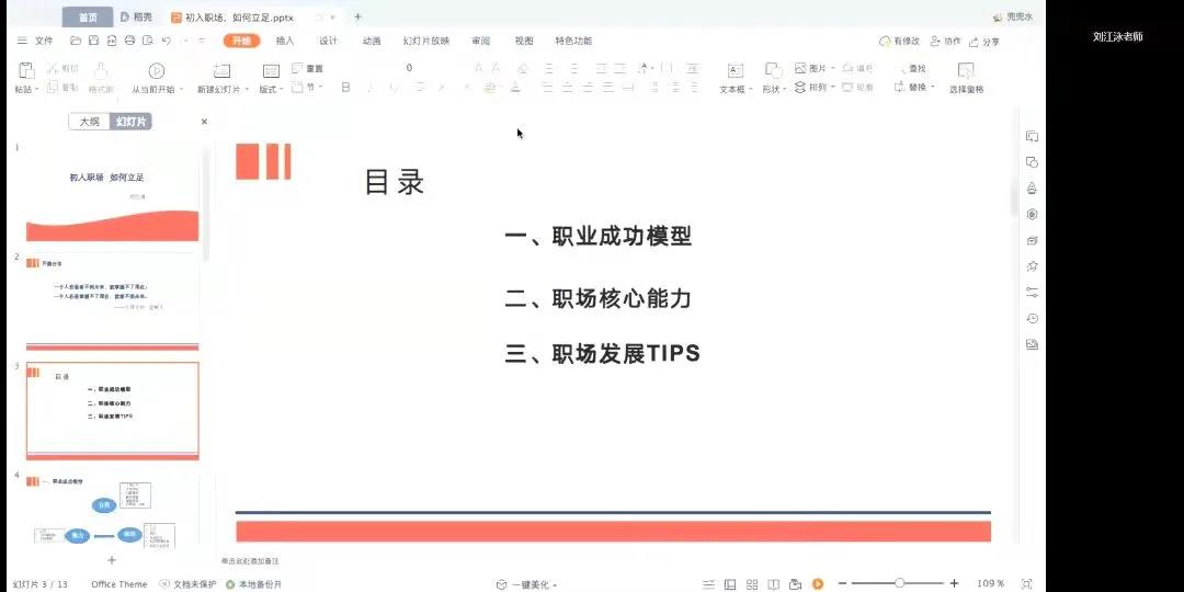 刘江泳老师同学们分享的主题是“初入职场,如何立足”,引用了生涯大师金树人的“一个人若是看不到未来,就掌握不了现在;一个人若是掌握不了现在,就看不到未来”作为开篇,主要从三个方面进行阐述,分别是职业成功的模型、职场核心能力--认知,可迁移的技能,支持系统以及职场发展TIPS。