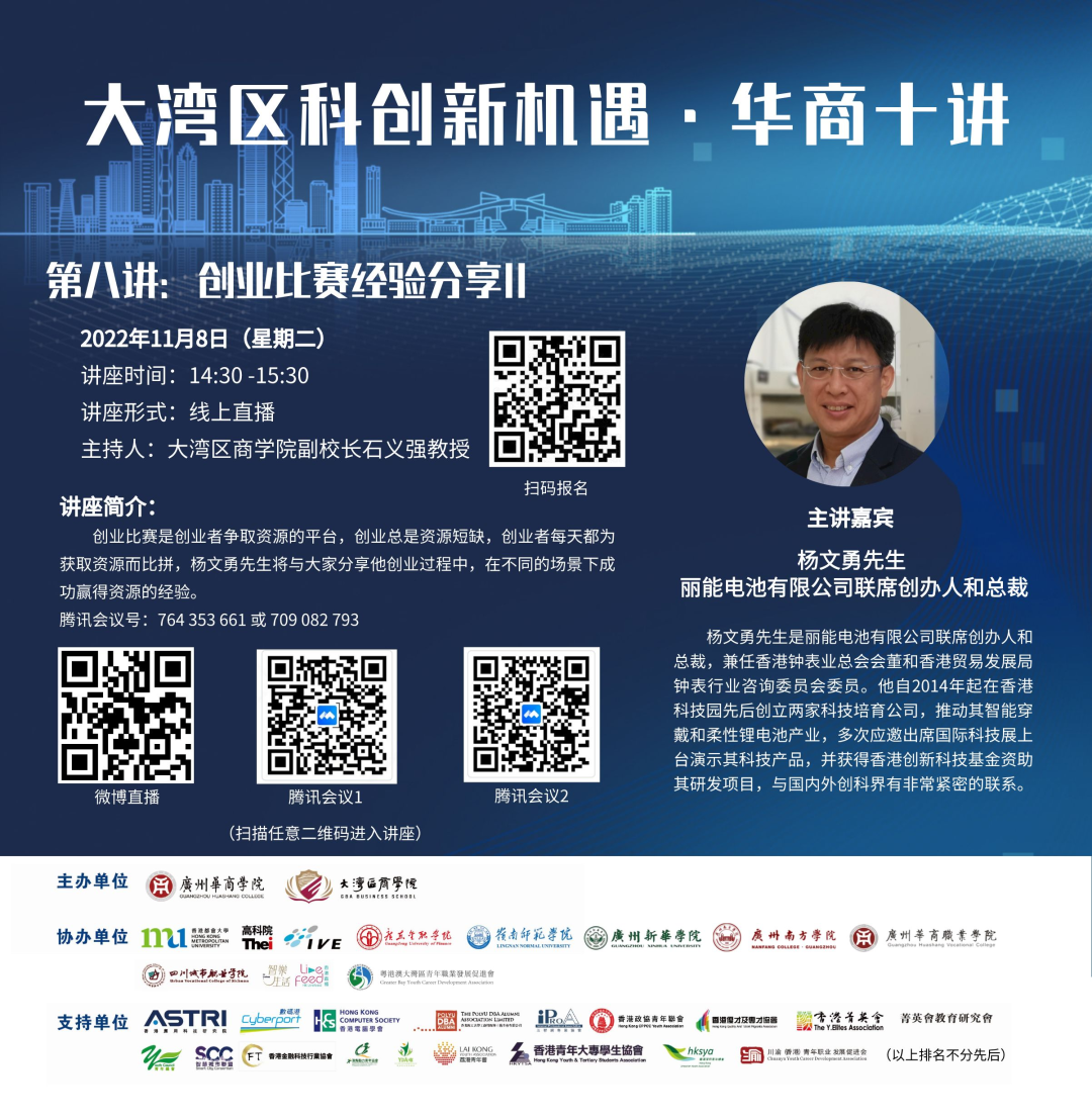 杨文勇先生是丽能电池有限公司创办人和总裁,兼任香港钟表业总会会董和香港贸易发展局钟表行业咨询委员会委员。他自2014年起在香港科技园先后创立两家科技培育公司,推动其智能穿戴和柔性锂电池产业,多次应邀出席国际科技展上台演示其科技产品,并获得香港创新科技基金资助其研发项目,与国内外创科界有非常紧密的联系。