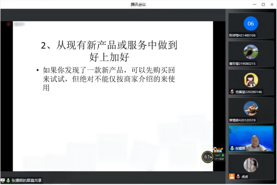 接着,张耀辉教授为大家详细介绍创新方案的改进五步法,由锁定一个目标到提出创意修改,深度剖析了创新的本质,意在提高学生们的思辨能力。此外,张耀辉教授引导学生争做领头羊,掌握独立思考的方法,增强团队协作能力。同时教导同学们积极分享思考结果,促进团队合作,共同进步。
