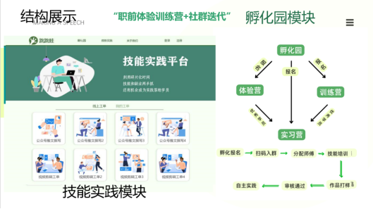 技能实践模块主要以“经营用户代替一次性买卖“社群裂变”的运营方式,开展一系列针对求职人士体验新岗位或开展副业的技能操作和技能活动。技能实践包括线上工单,用户可以针对自己的兴趣选择适合自己的职前体验训练营,并成为孵化体验学员。