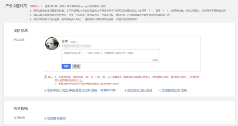 仅报名高教主赛道师生共创组的项目允许添加教师类团队成员,且编辑项目信息时“师生共创”一项须选择“是”才可添加,填写信息包括:真实姓名、国籍(默认中国)、院校所在国家(默认中国)、所在院校、所在部门、职称、手机号码、电子邮箱。