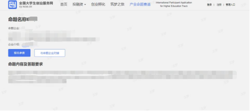 “产业命题赛道”页点击“立即报名”,该页展示所有发布的企业命题,可通过右上角输入“命题企业名称”及“命题名称”进行搜索。点击命题进入命题详情页查看具体详情信息,如下图。