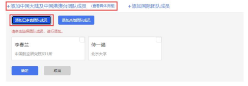 “添加中国大陆及港澳台地区的团队成员”操作时,若已添加项目并报名其他赛道,可点击“添加已参赛团队成员”后勾选已参赛的团队成员直接进行邀请。