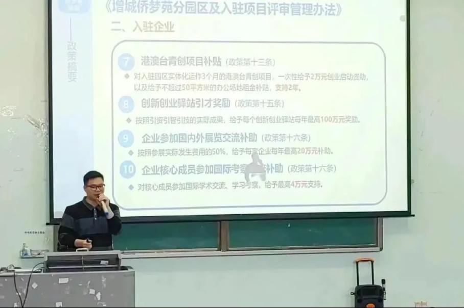 增城开发区科技创新局刘伟发同志表示,国家有使命,增城有作为。侨梦宛持续实施“一苑多区”发展战略,为港澳台青年来穗创业发展提供了优质的发展基地。此外,刘同志详细介绍了侨梦苑的系列政策和人才支持实施计划,表示对园区运营单位和入驻企业有资金奖励和创业补贴,同时也提供强有力的人才战略支撑。