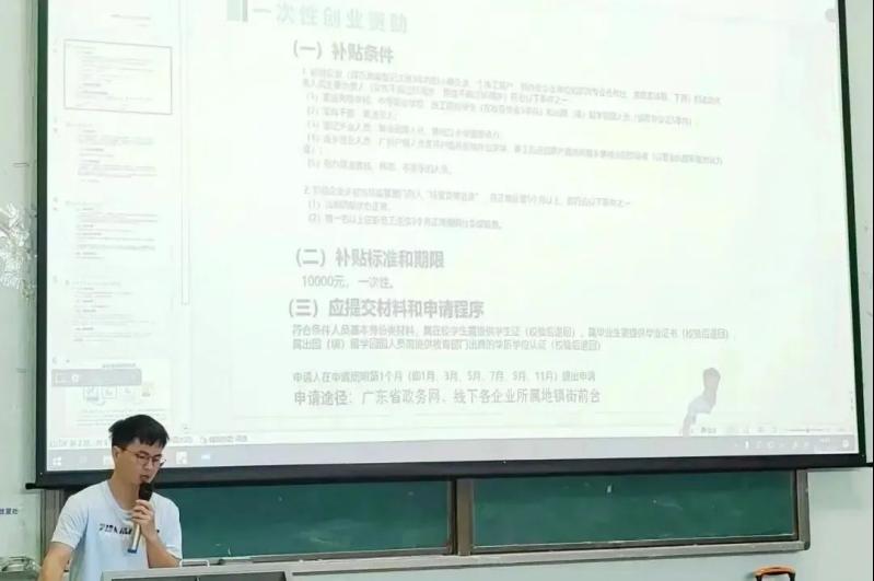 区人社局赵房军同志介绍市、区就业创业补贴政策。赵同志分别介绍了一次性创业资助、创业金补贴、创业带动就业补贴和大湾区青年就业计划生活补助的补贴条件、标准和期限以及应提交材料和程序申请,帮助大家加深对国家创新创业政策的认识。