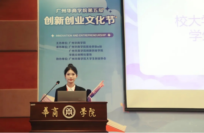 广州华商学院大学生创业协会主席团代表陈小冰发言,陈小冰师姐总结回顾往届活动的风采,向关心支持校大学生创业协会发展的各位领导、老师、同学表示衷心的感谢,并承诺协会将继续不忘初心、开拓创新,以高质量、高标准来办好文化节系列活动,希望各位领导、老师、同学共同关注,积极参与其中。