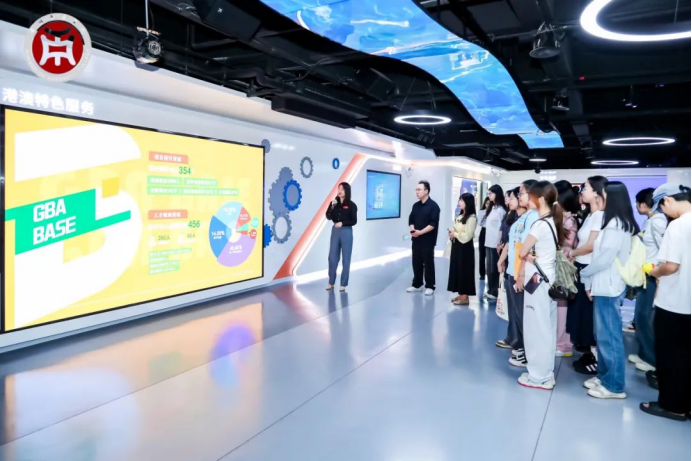 在基地港澳事务专员引导下,我校师生参观了主体展厅与双创服务大厅,系统了解了“1+12+N”港澳青创基地战略布局、港澳青年在湾区创业的政策支持体系及“创业全生命周期”孵化服务模式——从项目培育到资源对接,再到成果转化,为师生们带来全链条创业支持的新认知。
