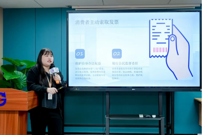 在主题讲座环节,广财咨询服务有限公司会计师以“发票的生命周期与税务合规”为题,为在场师生带来系统深入的专题讲解。讲座内容涵盖发票的种类划分、法律效力认定等基础知识,重点演示了发票从领购、开具、认证到保管的全流程操作规范。结合典型实践案例,对增值税、企业所得税等主要税种的申报流程、关键节点与常见误区进行了细致剖析,生动揭示了日常财税工作中的合规要点。