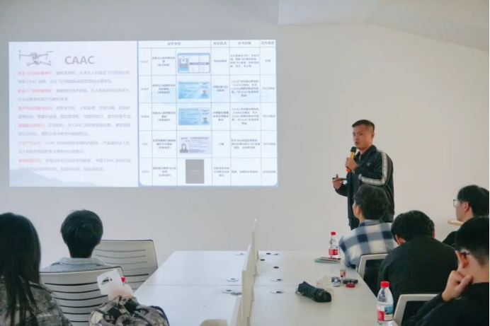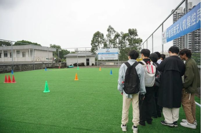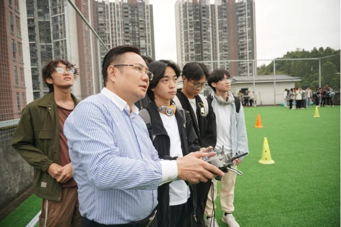 师生团队参观了公司核心技术与业务功能区,现场观摩了无人机飞行演示及相关操作讲解。随后的无人机数智化专项实训中,实操导师系统演示了标准飞行操作流程,重点讲解了“水平8字绕桩”“原地360度自旋”等关键飞行动作的技术要点与安全规范。在实操导师的指导下,师生团队分组开展无人机模拟飞行练习,逐步掌握了无人机飞行操控与航线规划的基本技能。