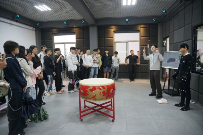 在AIGC与动作捕捉相结合的实训模块。指导教师组织学生进行了AIGC短剧创作实践,从镜头语言的创意构思,到灵活调用各类AI工具生成所需素材,帮助学生逐步将创意构想落地为具象的数字作品。师生团队走进了专业的光学动作捕捉实验室,通过观摩专业演员的动作捕捉全过程,深入了解了电影级动画内容的生成逻辑,并在此基础上,对比分析了AIGC技术相较于传统内容制作流程的优劣势,有效拓宽了学生对行业技术演进路径的认知视野。