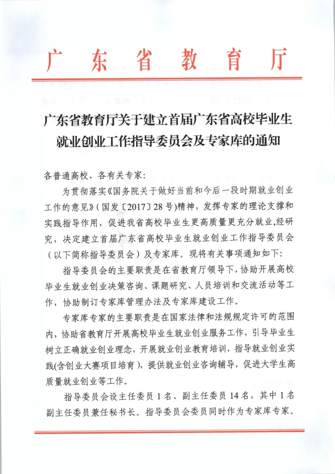 广东省教育厅为促进我省高校毕业生更高质量更充分就业,经研究,决定建立首届广东省高校毕业生就业创业工作指导委员会及专家库。专家库专家的主要职责是在国家法律和法规规定许可的范围内,协助省教育厅开展高校毕业生就业创业服务工作,引导毕业生树立正确就业创业理念,开展就业创业教育培训,指导就业创业实践(含创业大赛项目培育),提供就业创业咨询辅导,促进大学生高质量就业创业等工作。