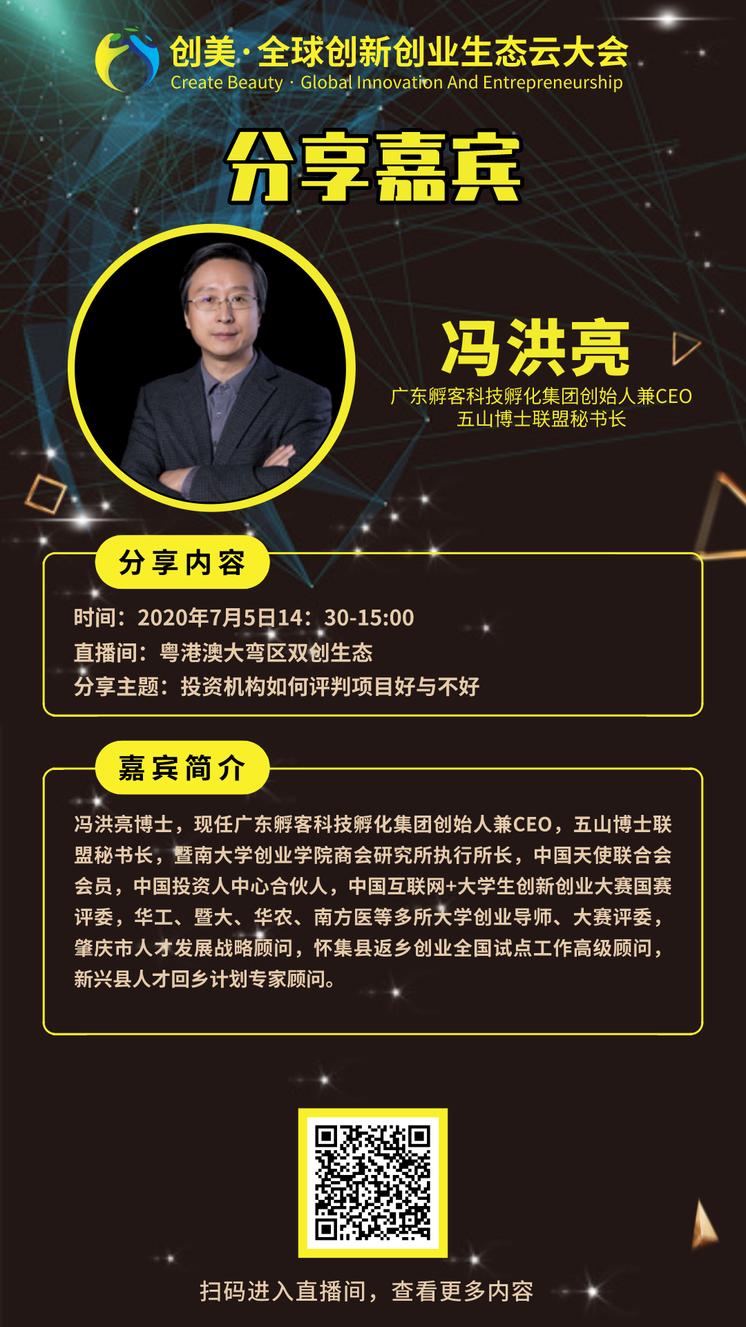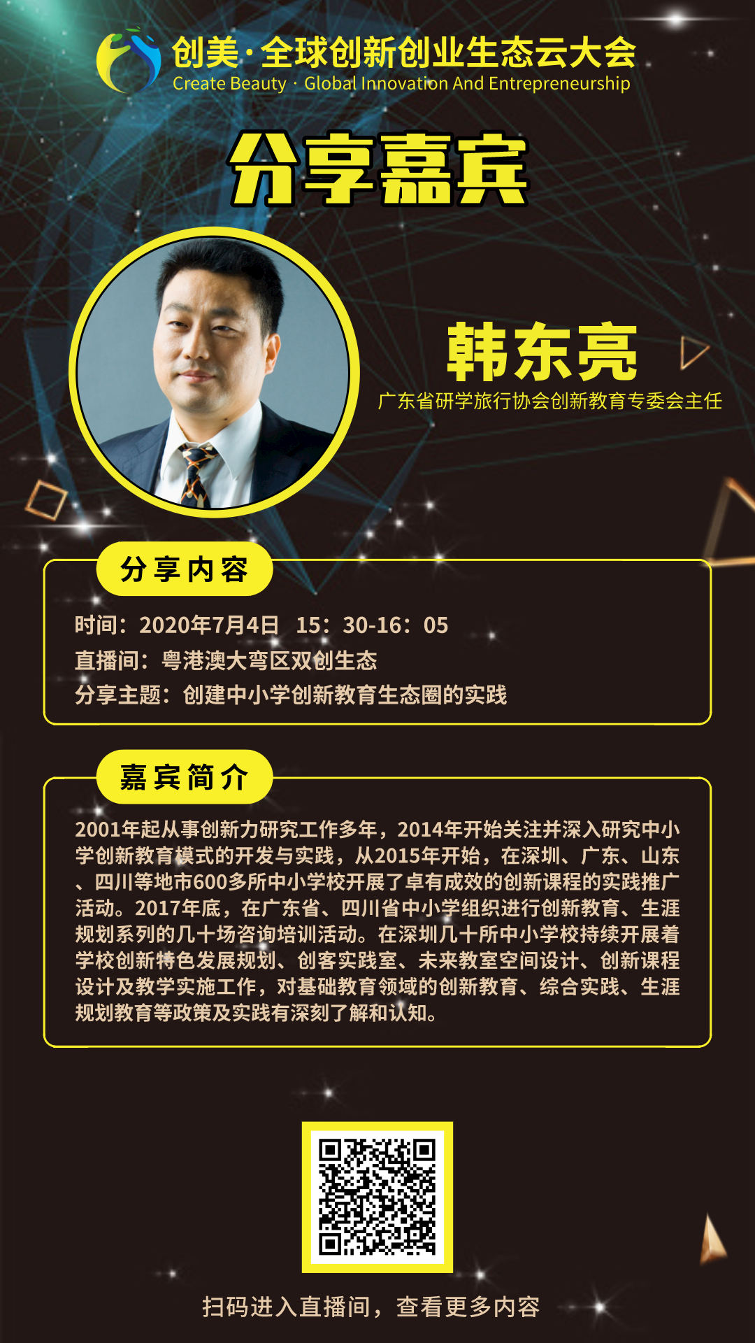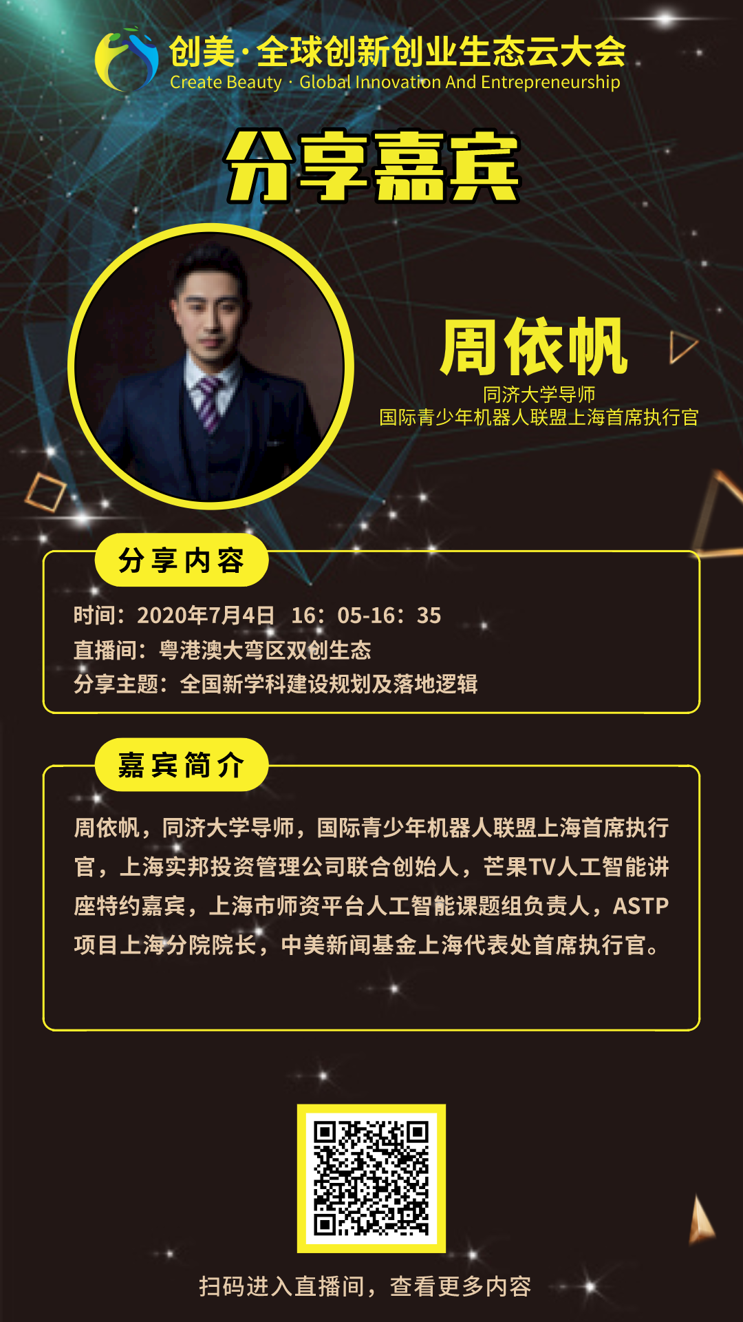 7月4日,创美·全球创新创业生态云大会粤港澳大湾区双创生态模块将正式开幕,20余个主题,包括生物医药、养老行业、现代农业、高校双创等多个话题,由多位深耕于这些领域的学者、企业家、政府工作人员进行展示。这将是一次关于粤港澳大湾区双创活动的生态展示和深度经验分享!