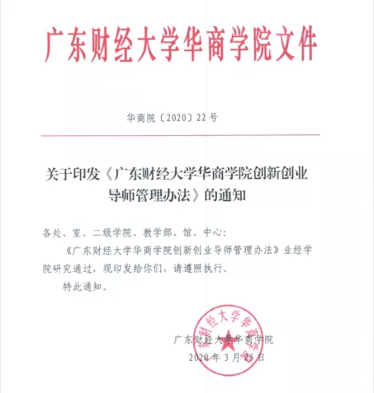 制定《广东财经大学华商学院创业导师管理办法》、《大学生创新创业训练计划项目管理办法》、《创业孵化管理暂行办法》。