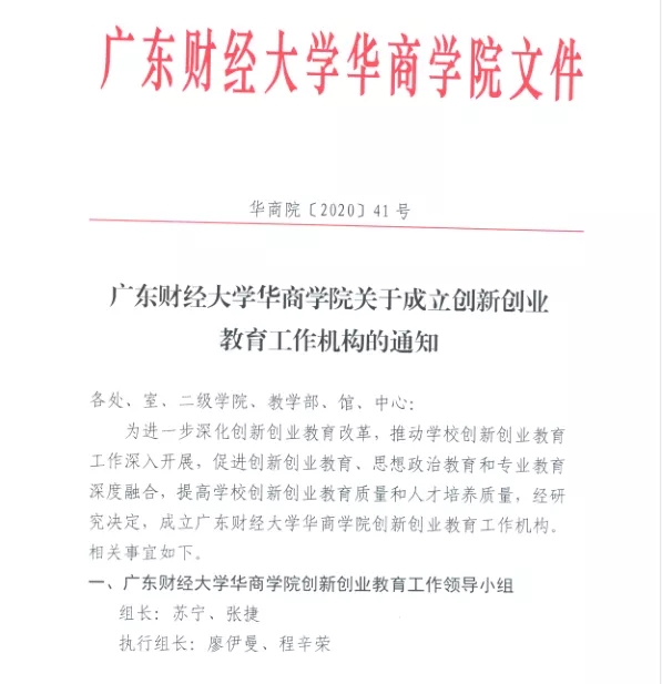 学校成立“广东财经大学华商学院创新创业教育工作领导小组”,由党委书记、分管副校长任组长,教务处、学生处、团委和创新创业学院等部门负责人参加的创新创业教育工作领导小组,定期研究部署创新创业工作。各二级学院和各系部成立“大学生创业教育工作小组”,由院(系)负责人担任组长,成员由分管学生工作的负责人、创业导师及辅导员组成,组织和落实创新创业训练计划项目推进、创新创业竞赛活动、创业学分认定申报、制定适合本院(系)的实施细则。