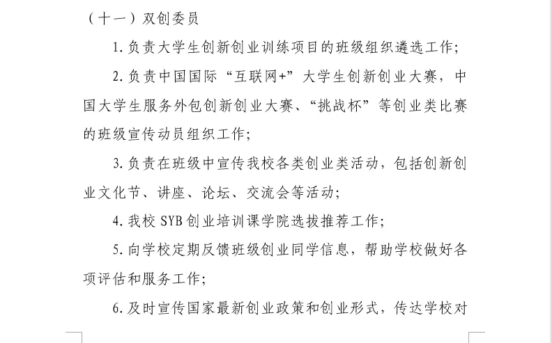 每班选取一名“双创委员”代表学生与办公室联系与沟通,及时接收、传达各级各类的创新创业活动资讯。