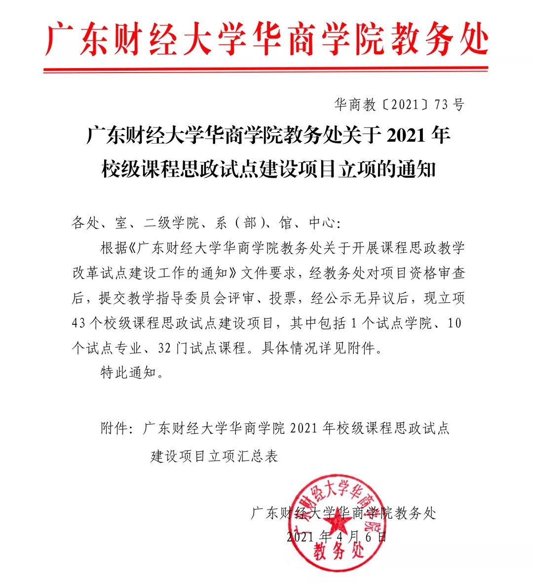 近日,根据《广东财经大学华商学院教务处关于开展课程思政教学改革试点建设工作的通知》文件要求,经教务处对项目资格审查后,提交教学指导委员会评审、投票,经公示无异议后,现立项43个校级课程思政试点建设项目,其中包括1个试点学院、10个试点专业、32门试点课程。《创业管理》课程获得2021年校级课程思政试点建设项目立项。