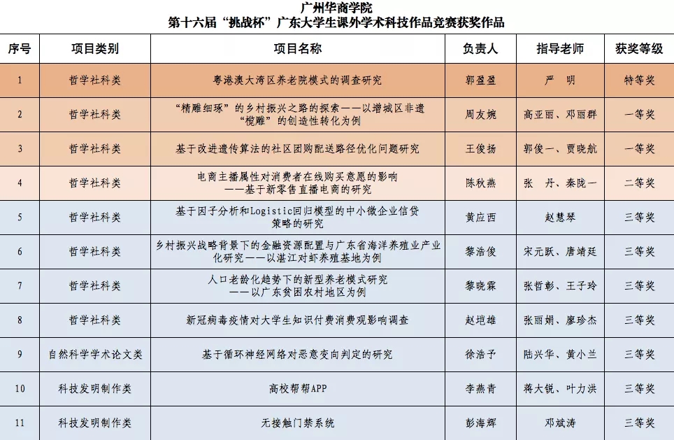 学校领导的高度重视,学校团委的全力配合,指导老师和参赛团队成员的给力打磨,实验教学与网络技术管理中心的技术支持、各二级院系的精心推选,我校在第16届“挑战杯”广东大学生课外学术科技作品竞赛中斩获佳绩。