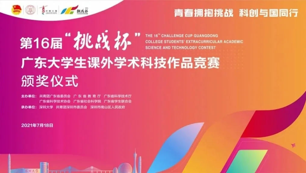挑战杯三十二载风华正茂,新时代科技创新恰逢其时。7月17日至18日,由团省委、省教育厅、省科技厅、省科协、省社科院、省学联共同主办的第十六届“挑战杯”广东大学生课外学术科技作品竞赛终审决赛在深圳大学顺利举办。