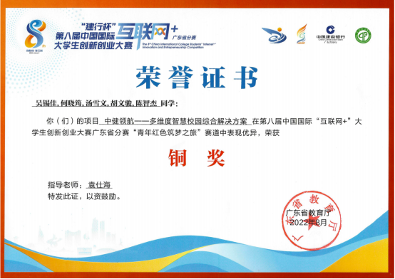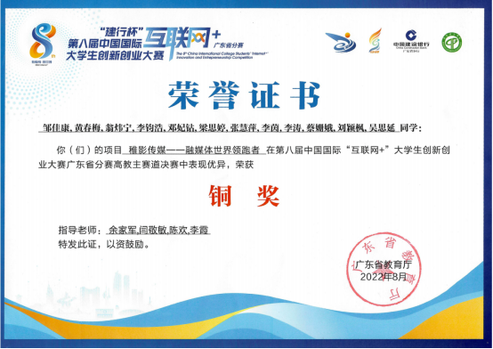 7月15日,“建行杯”第八届中国国际“互联网+”大学生创新创业大赛广东省分赛决赛在东莞理工学院松山湖校区圆满落幕。经过激烈角逐,我校《稚影传媒—融媒体世界领跑者》和《中健领航--多维度智慧校园综合解决方案》项目喜获铜奖。