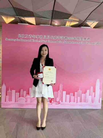 民政及青年事务局局长麦美娟女士为廖伊曼副校长颁发嘉许状及奖章