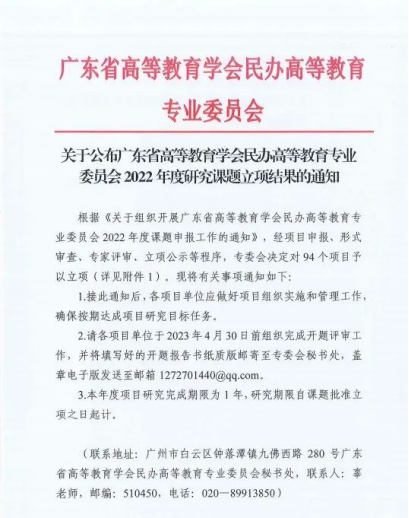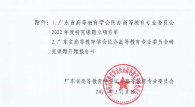 根据《关于组织开展广东省高等教育学会民办高等教育专业委员会2022年度课题申报工作的通知》等文件要求,经学校遴选推荐、省教育厅审核、评审、公示及异议复审等环节,我校余家军老师主持的“广东民办本科高校创新创业教育体系建设研究”项目获广东省高等教育学会民办高等教育专业委员会2022年度研究课题立项。