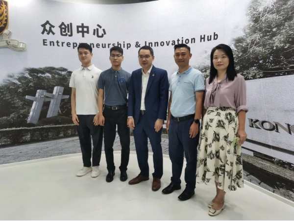 香港中文大学深圳研究院执行院长林煌权博士(右三)、项目发展部项目经理周玉花博士(右一)、华商2011届毕业生黄伟(右二)、2022届毕业生邹佳康(左一)、梁文康(左二)