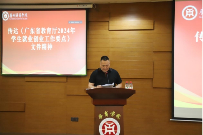 会议伊始,曾龙威处长传达了《广东省教育厅2024 年学生就业创业工作要点》文件精神,切实做好高校毕业生就业创业工作,确保2024届高校毕业生就业大局稳定。坚持以习近平新时代中国特色社会主义思想为指导,全面贯彻党的二十大、二十届二中全会,中央经济工作会议精神和省委省政府部署要求,坚持稳中求进、以进促稳、先立后破的工作主基调,以就业育人为根本,以观念引导为主线,以拓展岗位为支撑,以指导服务为抓手,推动高校毕业生高质量充分就业,激发创新创业活力,发挥创业带动就业倍增效应。