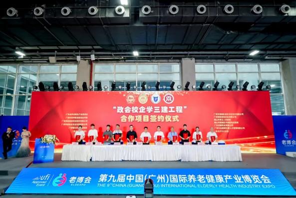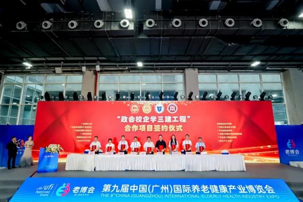 会议进行“政会校企学三建工程”合作项目签约仪式。学校与广东药科大学、广东省养老服务产业促进会、广东教育国际交流协会等18家单位进行合作项目签约。