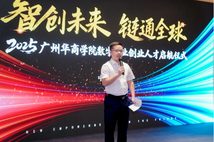 广州华商学院副校长余家军致辞。他表示,在当前数字经济蓬勃发展的时代背景下,学校通过引入行业优质资源,为学生搭建真实创业场景,助力学生在实干中淬炼能力、在创新中实现突破,这是推动专业教育与创新创业教育深度融合的重要实践。他对新生提出三点期望:一要立鸿鹄之志,存报国之心。将个人理想熔铸于国家社会经济发展之中,以赤子之心服务社会,以创新价值贡献寰球;二要博观而约取,厚积而薄发。主动寻求跨领域的知识融通和国际化的视野拓展,注重培养批判性思维与创新创业意识;三要格物以致知,躬行以实践。主动向产业前沿求索,将求知欲化为行动力,在实干中淬炼能力,在创业中收获突破。