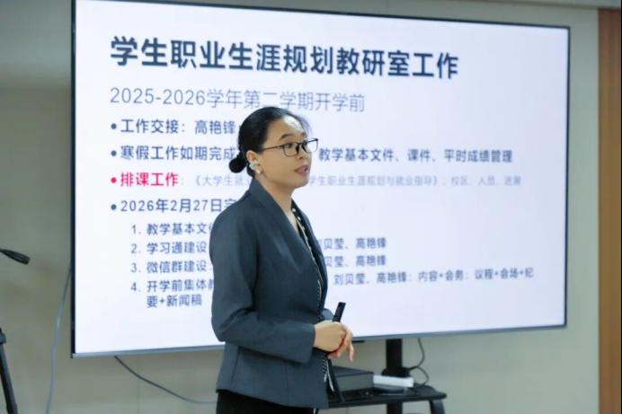 会议伊始,高艳锋院长助理就学院2025-2026学年第二学期教学准备工作作专项汇报。结合上学期教学工作中暴露出的问题与薄弱环节,系统梳理了本学期教学工作的整体思路与具体安排。