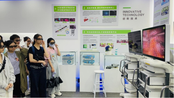 随后,师生们移步至公司的展示体验中心,重点参观了公司最新推出的4K光学3D荧光腹腔镜系统。这款产品集高清成像、精准导航、智能辅助于一体,充分体现了“科技改变医疗”的理念,引起师生们极大兴趣,纷纷就设备的成像原理、临床应用等方面提出专业性问题,现场交流热烈。