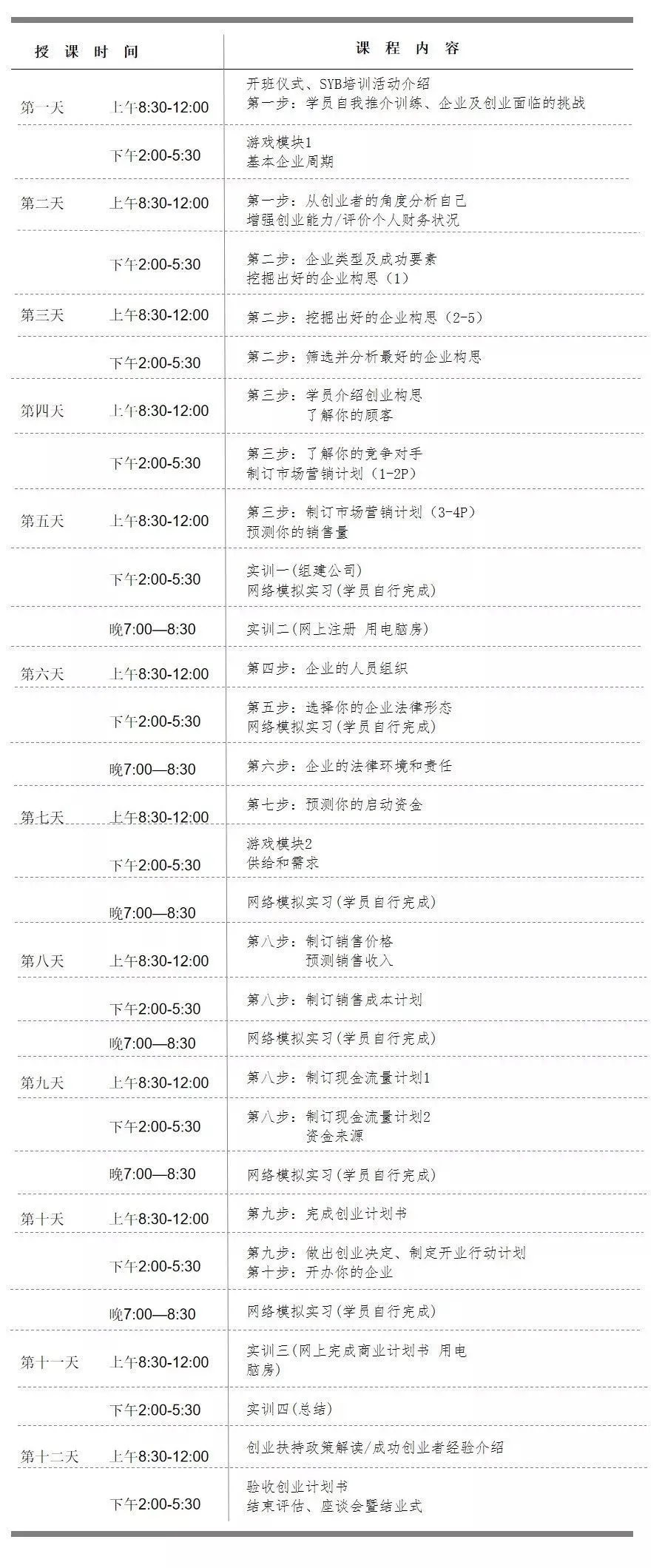 目前SYB培训为国家推广的一种免费商业创业培训,通过规定时数的培训,培训合格者将获得国家颁发的创业培训证书,毕业前颁发。