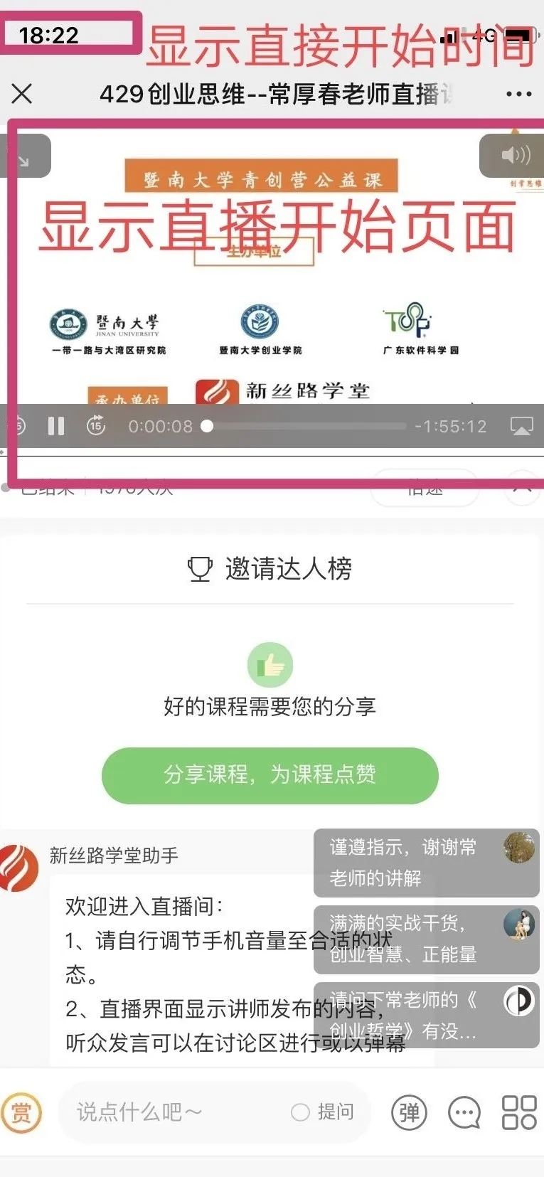 需要观看完完整的直播,凭取两张截图,在直播结束后,扫描下方二维码填写完整的个人信息和上传两张截图,方可获得创业印花,待回校后兑换。