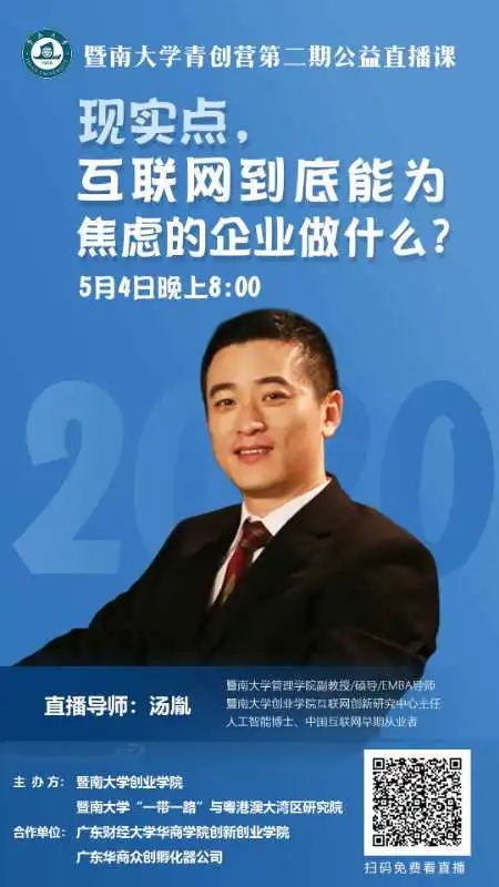 暨南大学管理学院副教授、硕士、EMBA导师,暨南大学创业学院互联网创新研究中心主任,人工智能博士、中国互联网早期从业者。