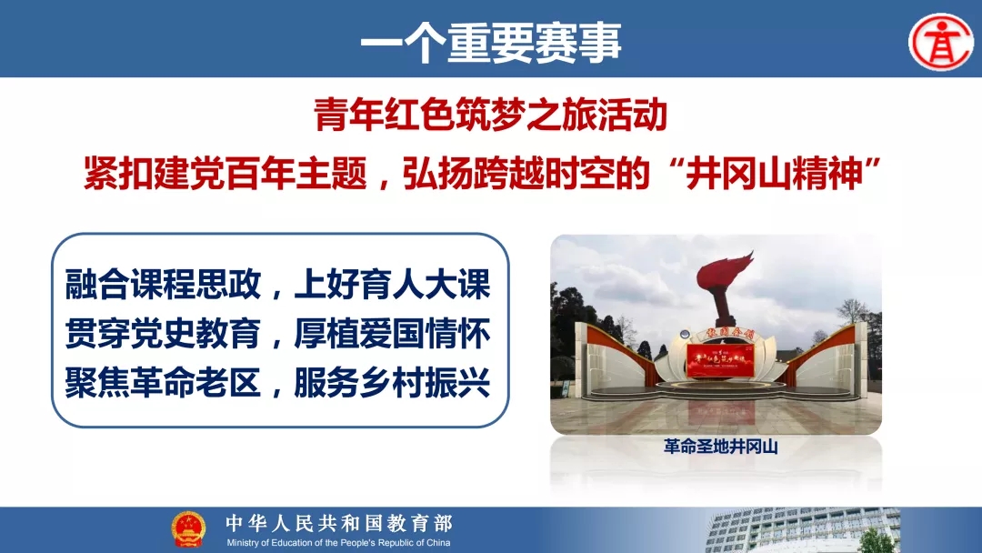 2021年4月1日,“2021年全国高教处长会”在陕西西安召开,教育部高教司司长吴岩在《夯实教学“新基建” 托起培养高质量》主题报告中指出要办好第七届中国国际“互联网+”大学生创新创业大赛,凸显大赛更国际、更全面、更创新、更中国、更教育的“五更”办赛目标。以“我敢闯,我会创”为大赛主题,聚焦“五育”并举的创新创业教育实践,完善线上线下相融合的赛事组织形式,办一场全球最大规模双创盛会。关于青年红色筑梦之旅活动,要紧扣建党百年主题,弘扬跨越时空的“井冈山精神”。