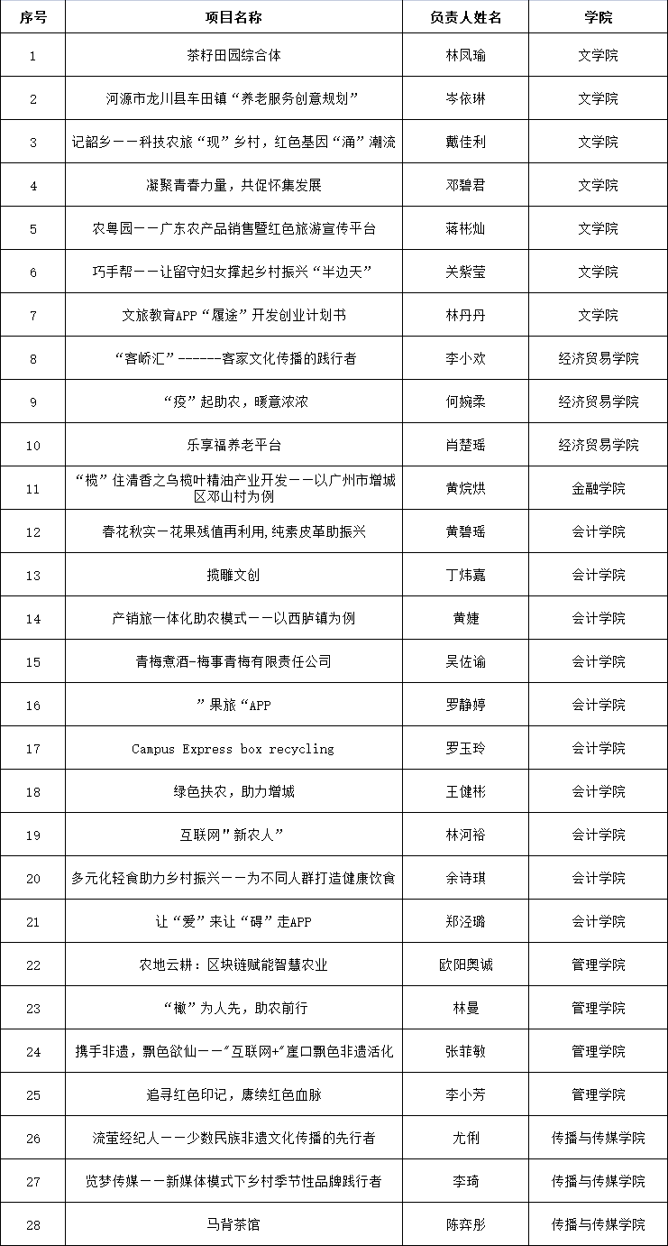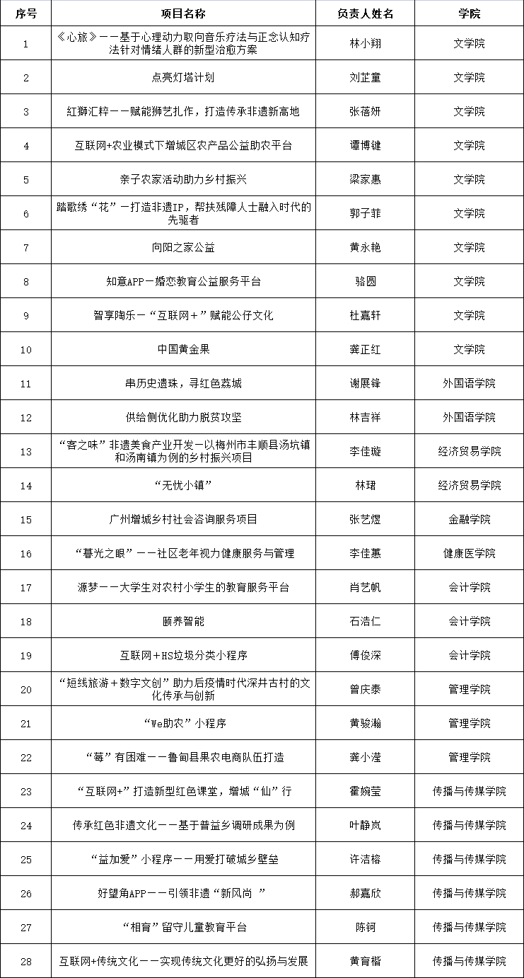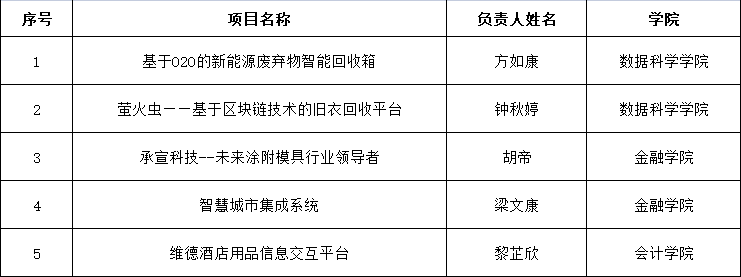 经学校组织专家评委对广州华商学院第八届中国国际“互联网+”大学生创新创业大赛校拟培育项目进行评审,现公布第八届中国国际“互联网+”大学生创新创业大赛校级培育项目名单。