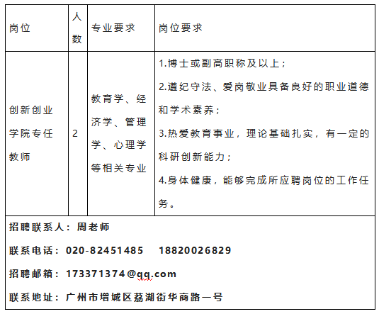 为进一步助力创新创业人才培养,优化师资结构,满足学校创新创业工作的发展需要,现公开招聘2名专任教师。 广州华商学院创新创业学院期待您的加入!