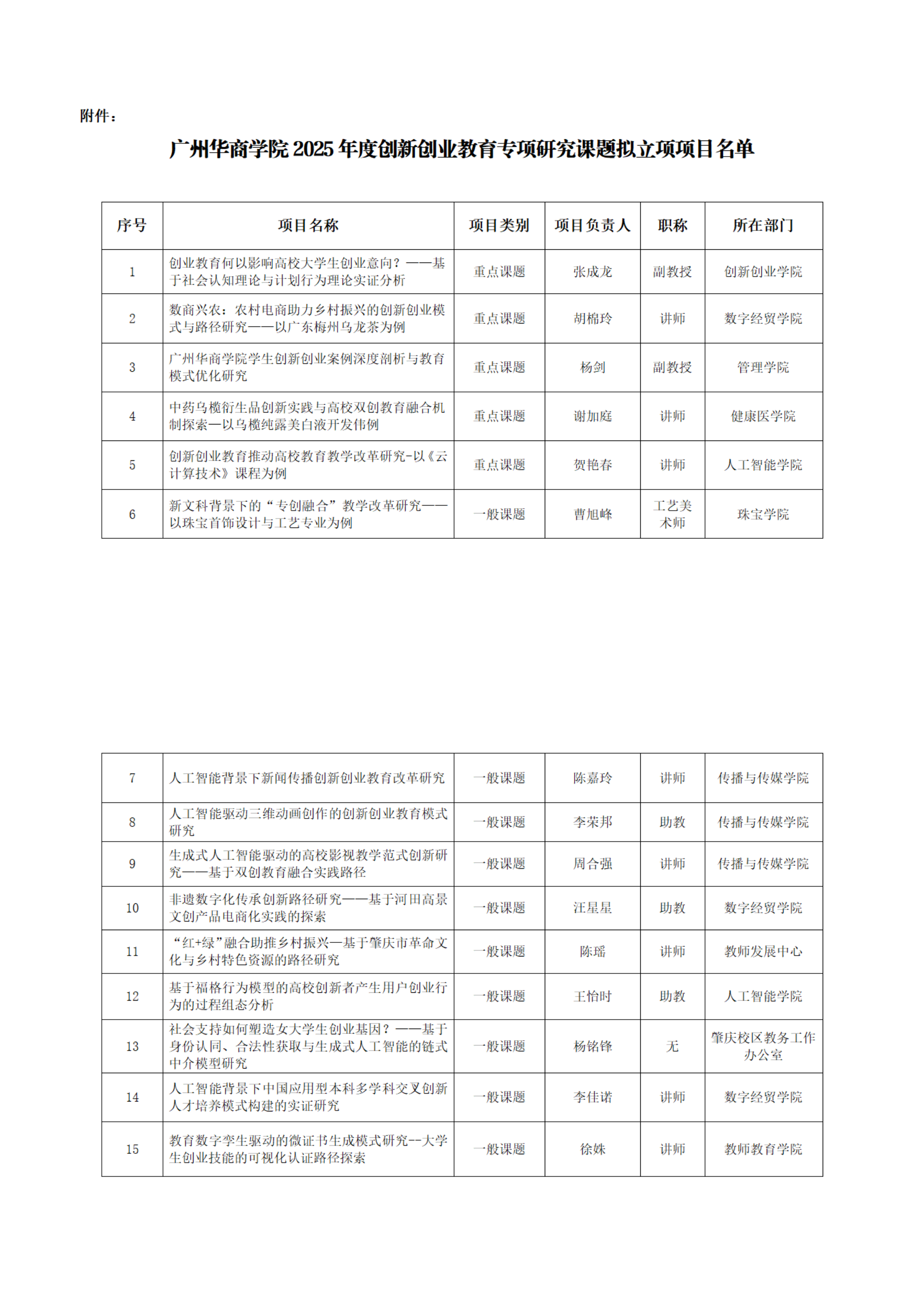 根据《广州华商学院创新创业学院关于开展2025年度创新创业教育专项研究课题申报工作的通知》(华商创〔2025〕13号)文件要求,经组织校内外专家评审,拟立创新创业教育专项研究课题15项,其中包括重点课题5项,一般课题10项。具体立项情况详见附件。